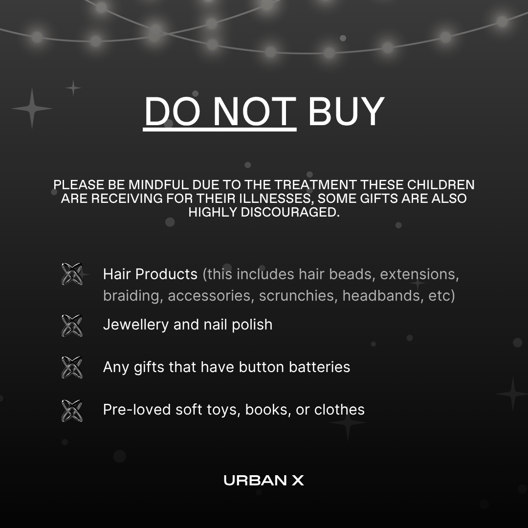 Physical gifts can be donated and delivered to URBAN X HQ up until Wednesday the 10th of December.